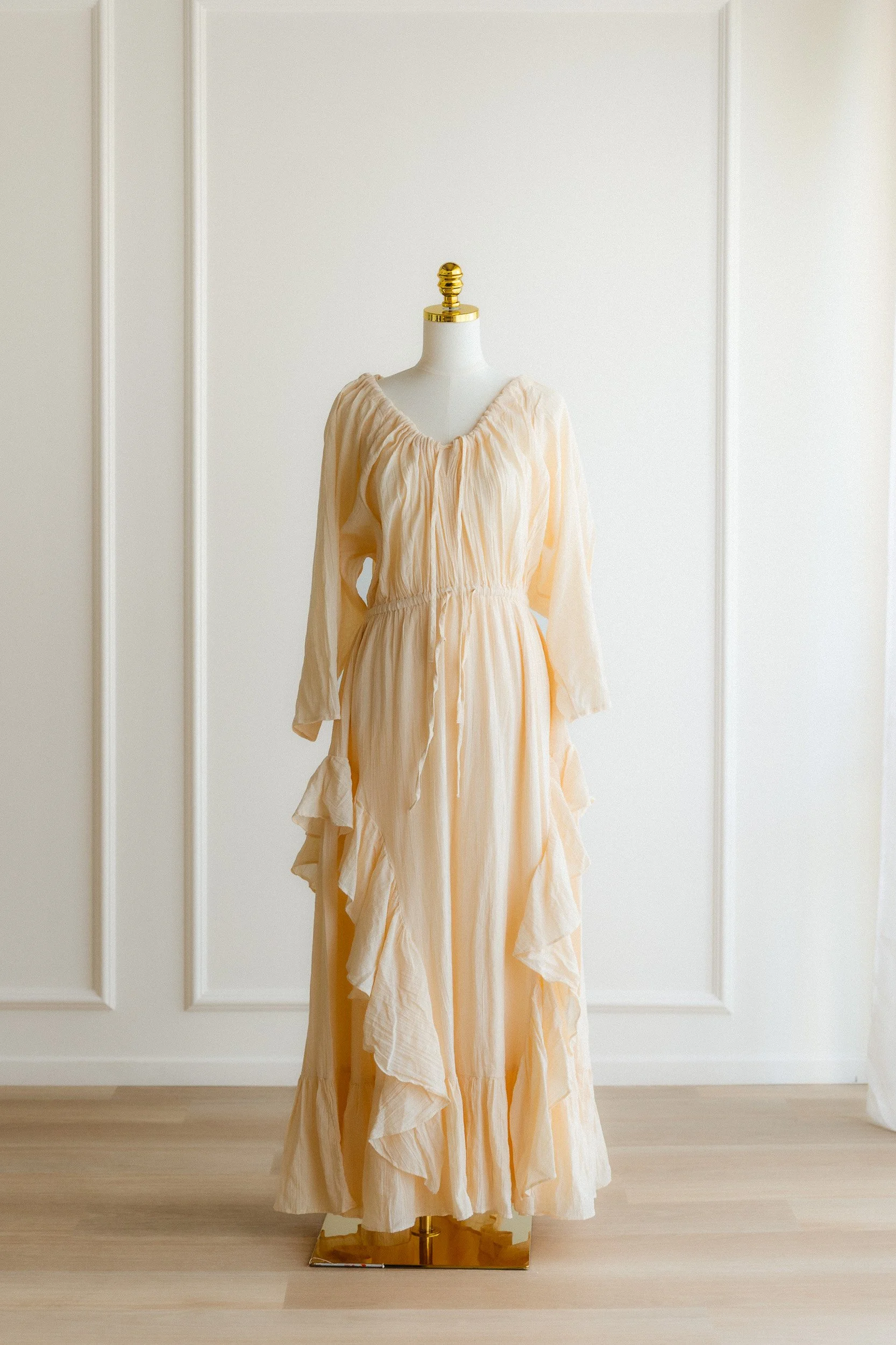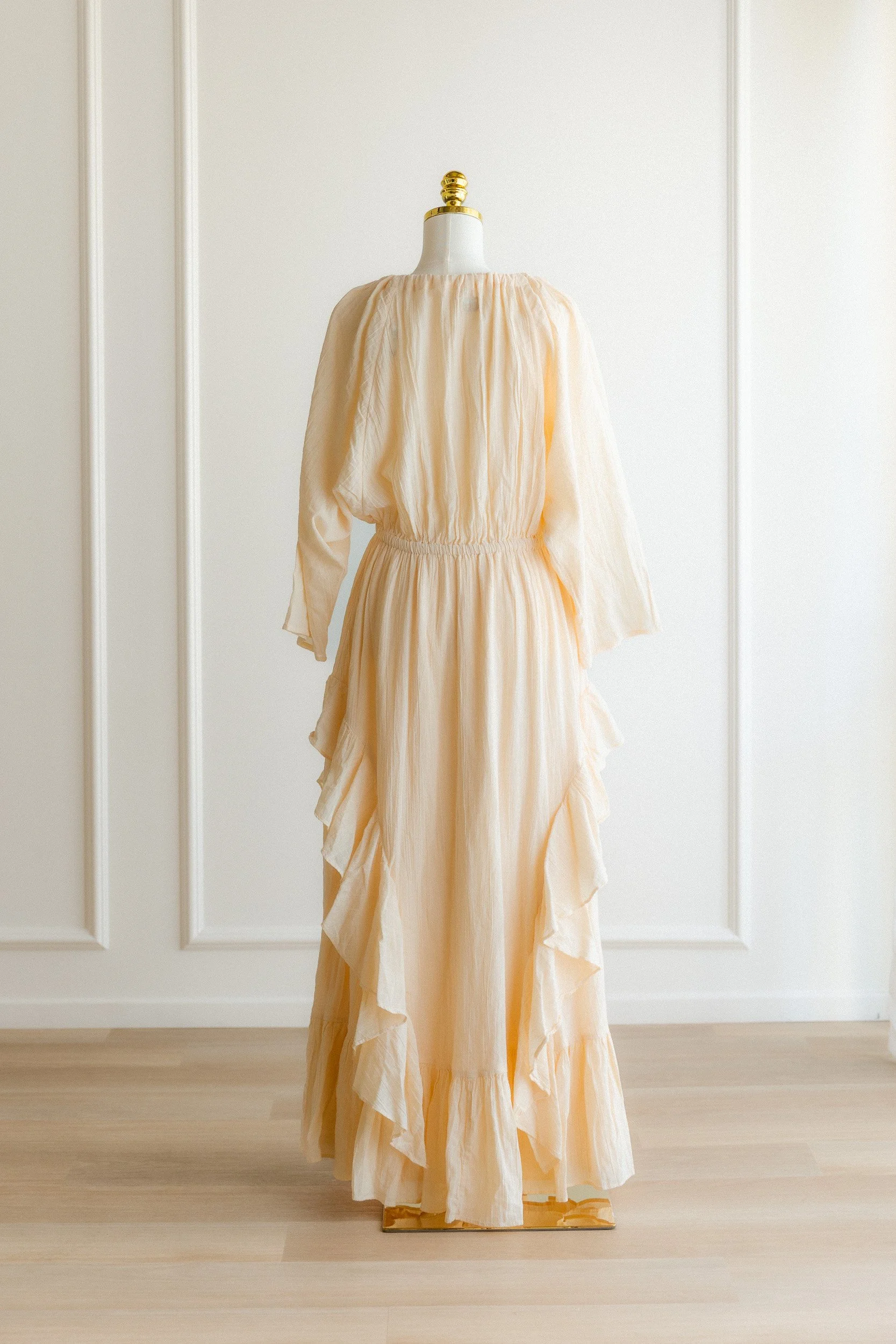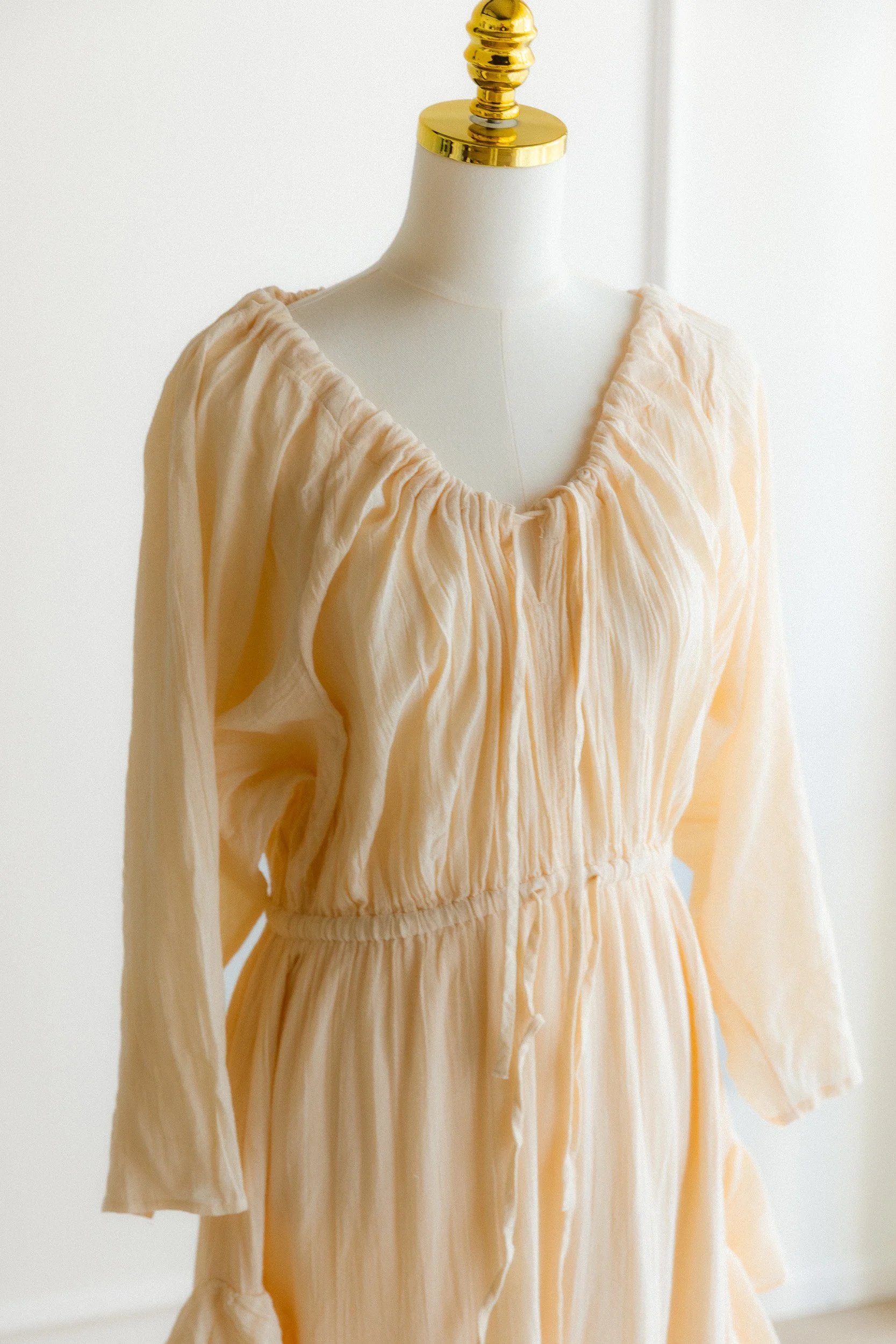 Soft peach gauze with a wide scoop neckline, gathered elastic waist, and cascading ruffle detail through the sleeves and skirt. Lightweight and textured with a lot of natural movement. The warm, muted peach tone complements most skin tones beautifully in natural light without washing anyone out.