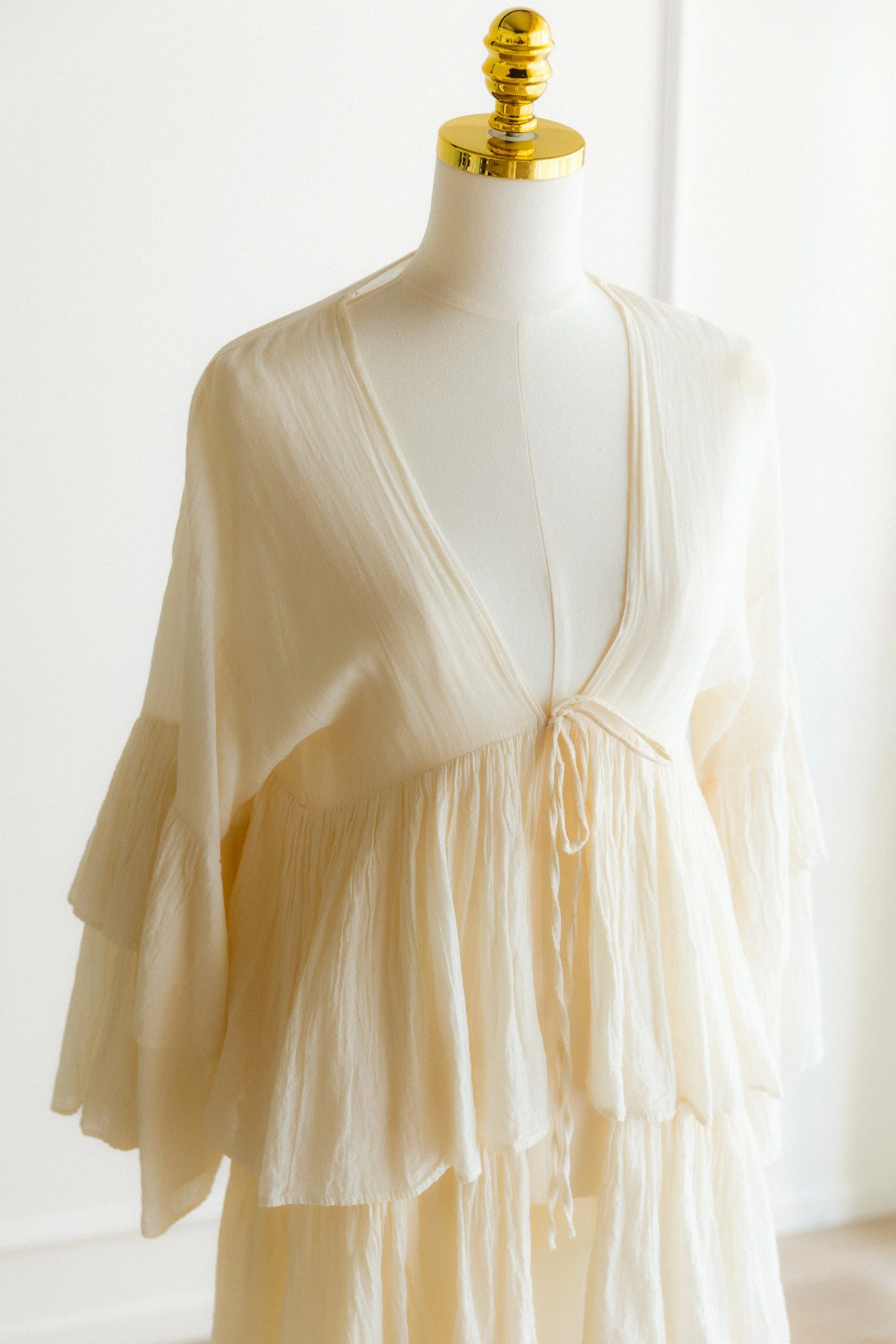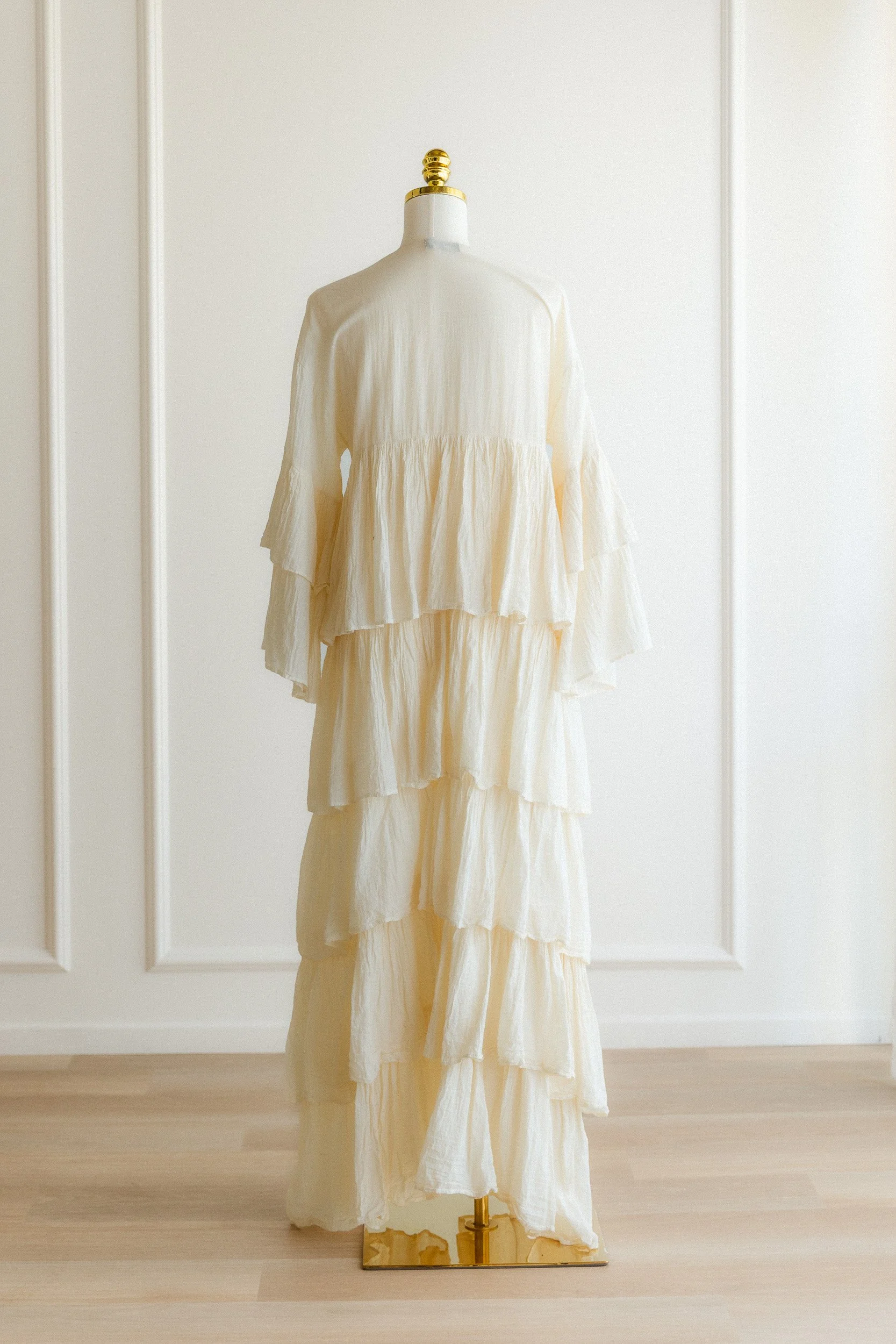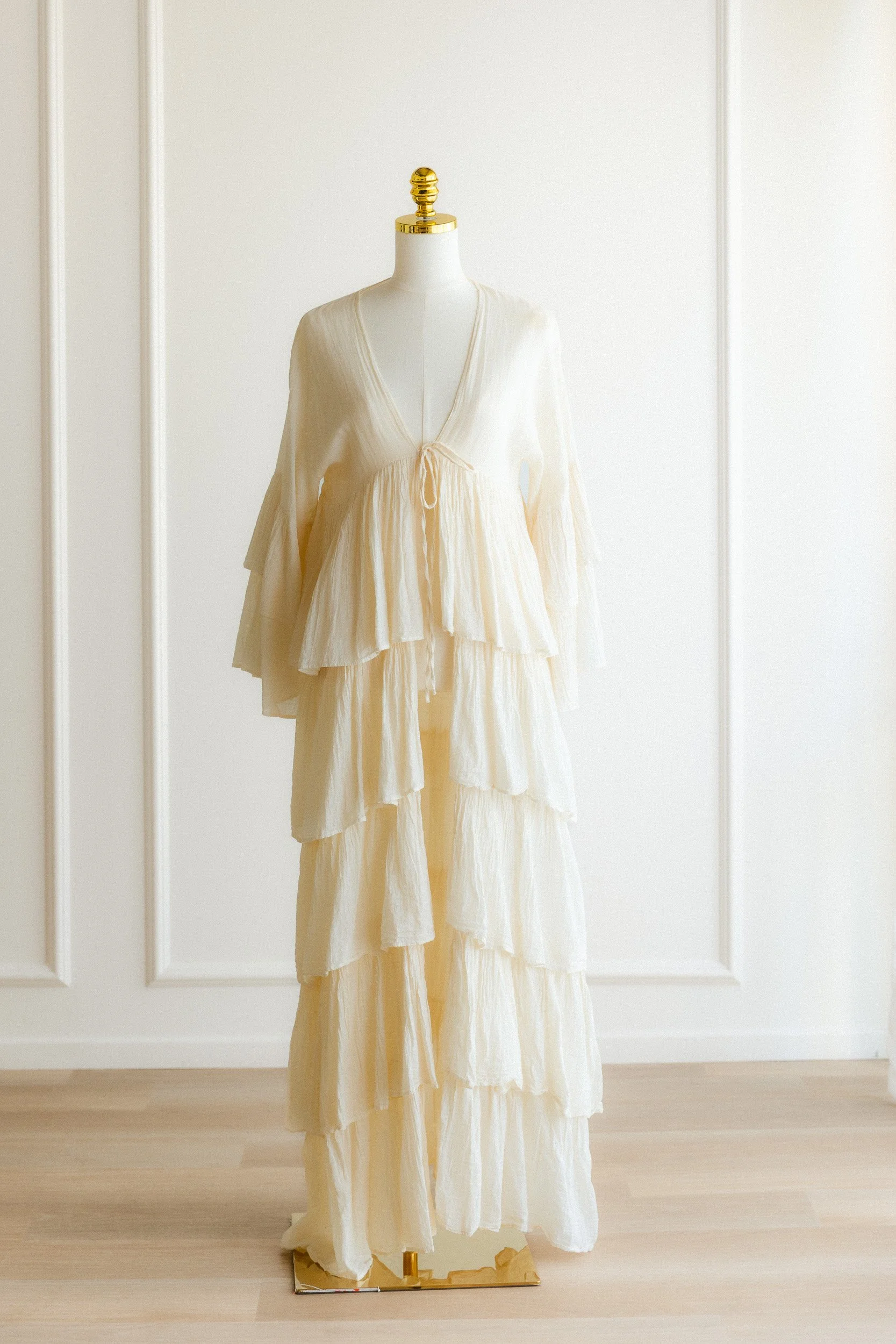 A sheer cream robe with a deep V neckline, tie-front closure, wide bell sleeves, and tiered ruffle layers through the full-length skirt. Open and flowing. Meant to be layered over a bra and underwear, a bodysuit, or worn as a cover-up during a maternity session. Adds a lot of movement and dimension without adding structure.
