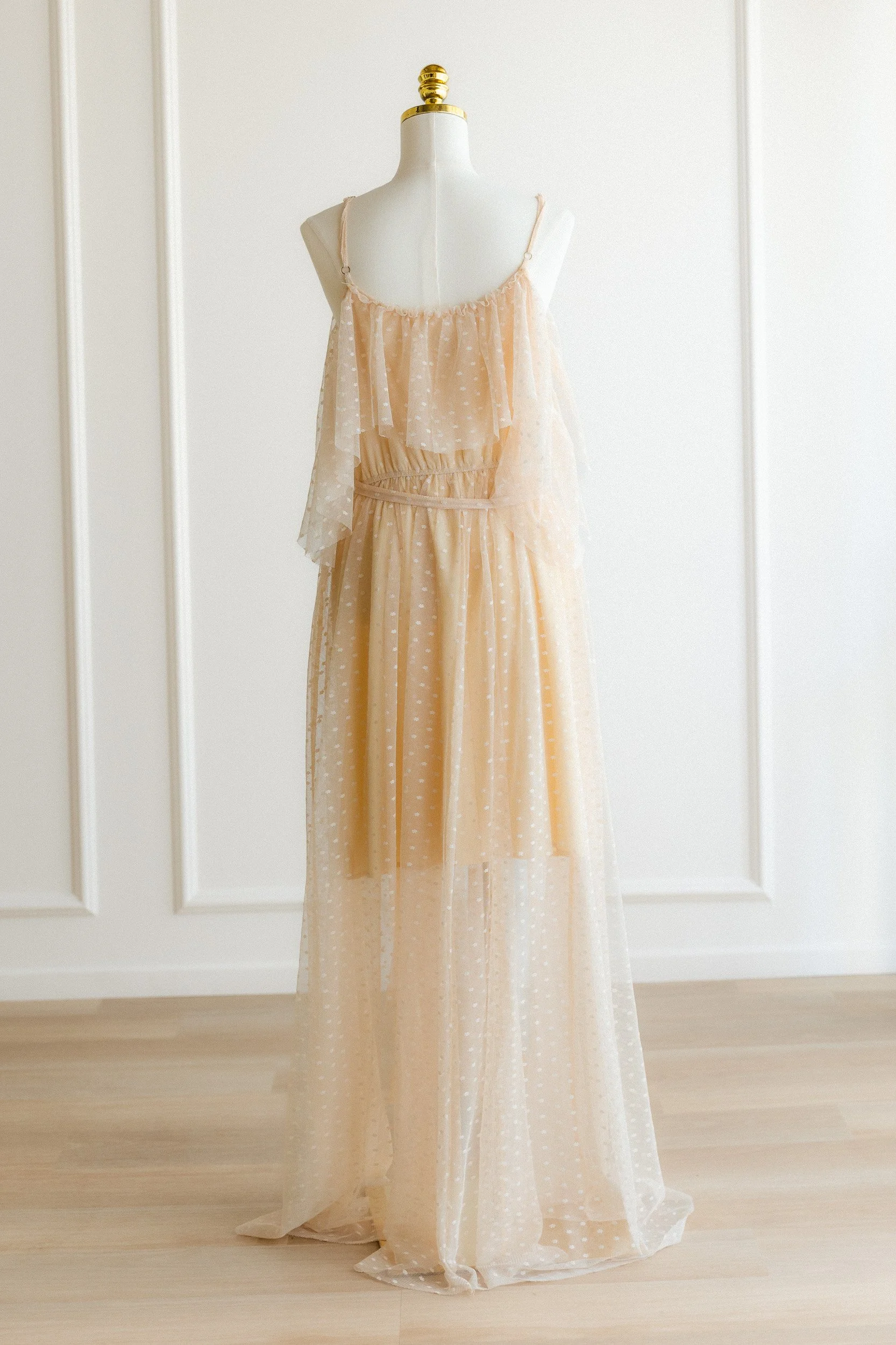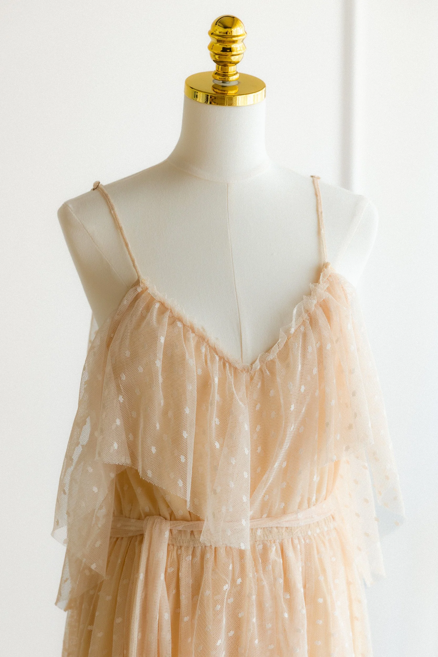 A sheer peach tulle dress with thin spaghetti straps, a deep V neckline, a single flutter sleeve detail, and a waist tie. The fabric has a soft dot pattern throughout and layers with a lot of airiness and movement.