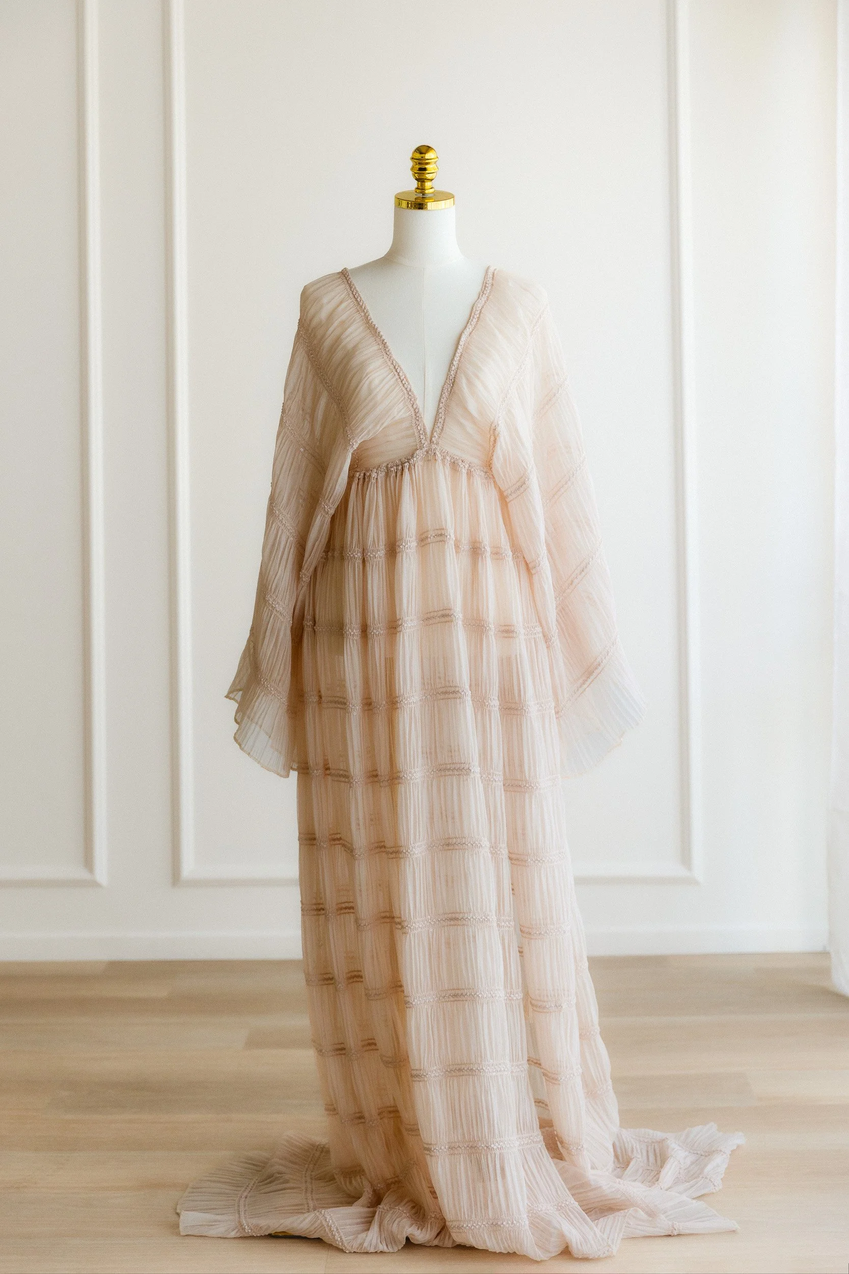 A blush textured sheer gown with a deep V neckline, wide bell sleeves, a tassel tie at the back, and a long pleated train. Completely sheer, so it's worn over a slip or bodysuit (both provided). The fabric has a woven stripe texture that catches light beautifully. Loose and flowing with a lot of presence.